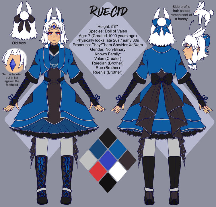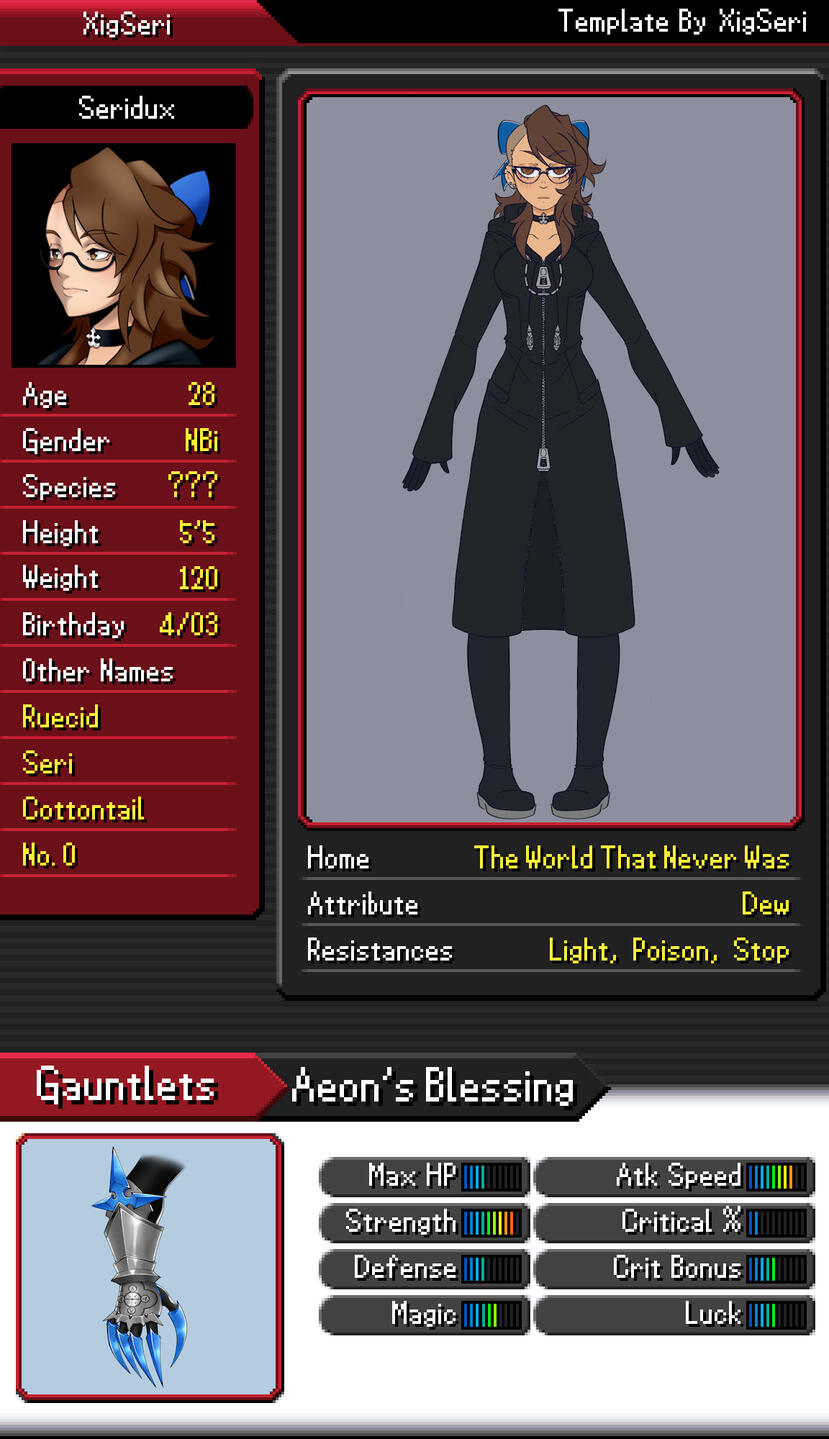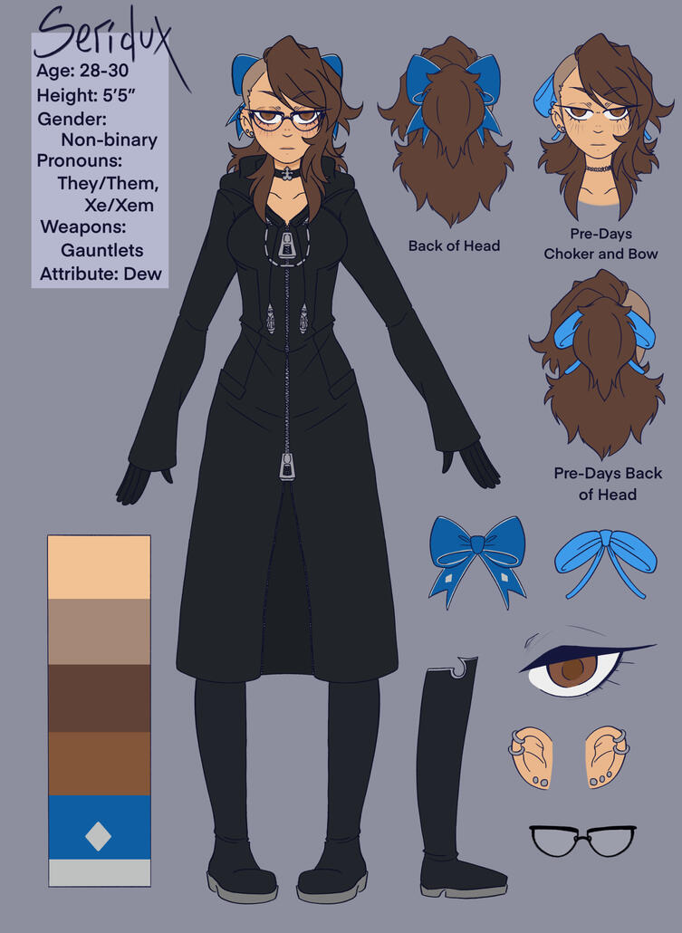 Seridux (original name Ruecid) is a Kingdom Hearts fan character originally from Aeon's Domain, a world based on the game Threads of Fate (also known as Dewprism). Their pronouns are They/Them, Xe/Xem and She/Her.