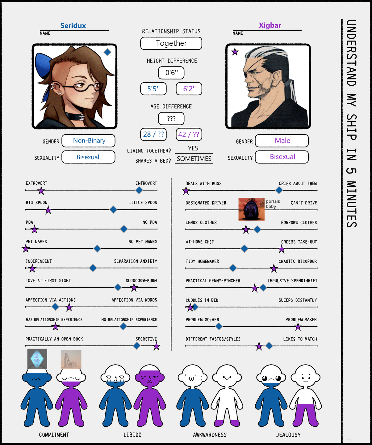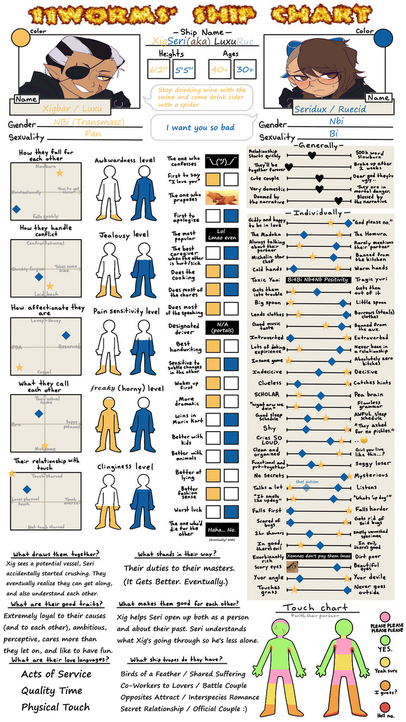 Kingdom Hearts: XigLux | RokuXiNami | SoRiKai | MXehaXig | AnsemXig | AkuSai | TerrAqua | MarLarx | Larxqua | Zemyx | XalLex | RepliNami | LexVexATLA/LoK: Kataang | Maiko | Jinko | Taang | MaiLee | Sukka | Borra | KorrasamiNaruto: SakuKarin | SasuSui | KakuKisa | YahiKonan | SasuKarin | KisaObi | KakaGai | MinaKushi | NaruSaku | NaruHina| NaruGaa | SasuNaruSasu | SakuInoDanny Phantom: Danny/Valerie | Vlad/Jack/Maddie | Vlad seeking therapyPokemon: Archie/Maxie | Lysandre/Cyrus | Guzma/Plumeria | Cyrus/Cynthia | Colress/Faba | Cynthia/Diantha | Volo/Cyllene | Giovanni/Rose | Ghetsis/GiovanniLegend of Zelda: Midna/Link | Midna/Zelda | Zelda/Link (non-TP) | TetraLink | LanaLinkleTeen Titans: BB/Terra | Robin/Starfire | Robin/Raven | Starfire/Raven | Kid Flash/Jinx | Terra/RavenMisc: Belle/Duke (Dewprism) | DrakGo (Kim Possible) | Veronica/Christine (FONV) | EdWin (FMA) | RoyAi (FMA)OCs & Self-Inserts: Xigbar/Seridux (mine) | Vlad/Erin (mine) | All my friends' yumeships | Xig/OC 👁️👄👁️ (open invitation to tell me about them on my strawpage) | random OCs i havent worked on lol