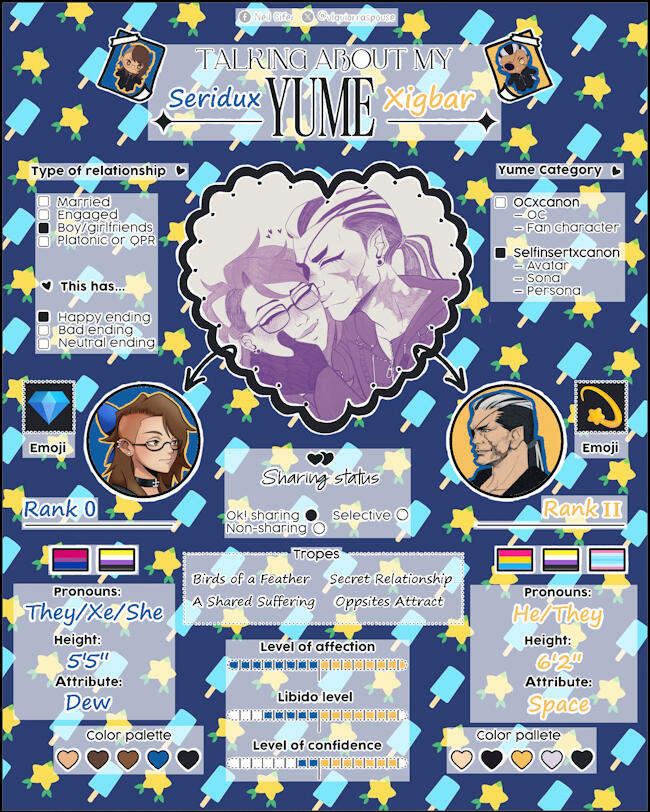 - Prefer anyone under the age of 16 to not follow, and anyone under 18 to not interact with any potentially suggestive posts I may RT. I will not post/RT any NSFW or very suggestive stuff on my main however. I prefer to avoid following minors first.- If you're a minor (or like, freshly 18), do not make sexual/suggestive comments under my posts, I will hide the reply and doing it too much will result in a block.- Don't feel obligated to follow back! I know twt can be weird about that but a follow back is never required.- Mutuals can ask for my discord where I talk more! Only 18+ (preferably 20+) mutuals can ask for my NSFW alt, though I barely use it.- I'm not online all the time due to work, so sorry if I miss anything important, please do not assume I'm ignoring things.- If Selfshipping / CanonxOC / etc makes you uncomfortable then you may not want to follow me.- While I'm pretty new to the whole yume fandom, I've actually been shipping myself with fictional characters since I was a small child, so I'm not exactly new to the concept, just the terms generally, so if I'm using a term incorrectly or there's a better one for something I'm talking about then feel free to let me know.
